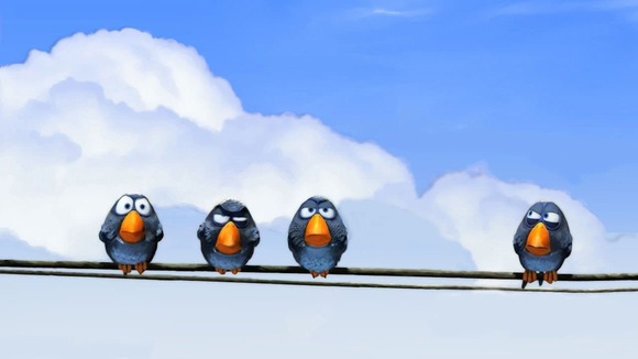 One by one, a flock of small birds perches on a telephone wire. Sitting close together has problems enough, and then comes along a large dopey bird that tries to join them. The birds of a feather can't help but make fun of him - and their clique mentality proves embarrassing in the end.