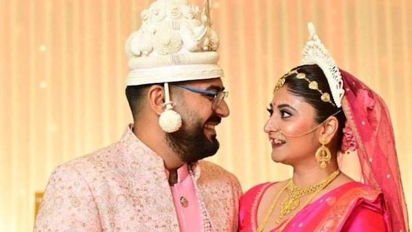 Earlier, Sandipta confirmed that she would try to keep her makeup simple and traditional. On the day of her wedding, she looked gorgeous in a fuschia pink Banarasi Sari. With a gold tiara, nath, and other gold pieces, she looked like a quintessential Bengali bride. Meanwhile, the groom chose a blush pink sherwani with an embroidered jacket.