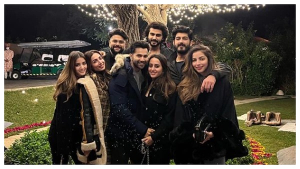 Malaika, Arjun, Varun, and Natasha are all in the group photo, along with designers Kunal Rawal and Arpita Mehta and actors Mohit Marwah and Antara Motiwala Marwah. As they stood in front of two big trees decked up with fairy lights, they all flashed a smile. Varun chose to wear a black glittery jacket with white sneakers and jeans. Wife Natasha matched him in all-black attire and slung a black bag over her shoulder. Malaika is dressed in a checkered skirt and a black jacket. She kept her hair loose and slung a brown bag over her shoulder. Arjun wore a black outfit as well.