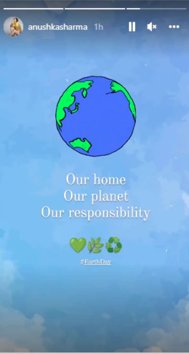 On Earth Day, the popular actress took to Instagram to share a story to spread awareness for protecting and conserving the earth. She says: "Our home," Anushka Sharma said on Instagram. #EarthDay (sic), our planet, our responsibility."